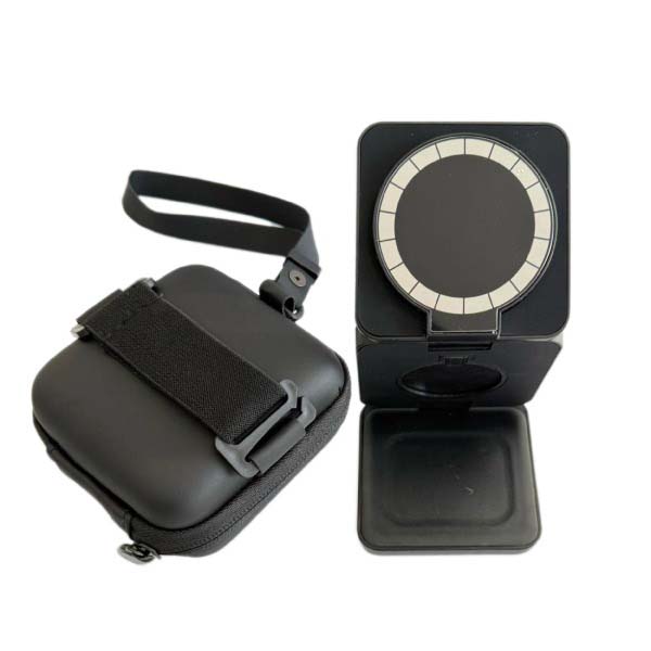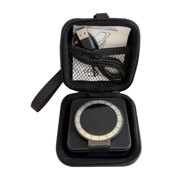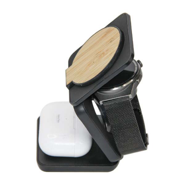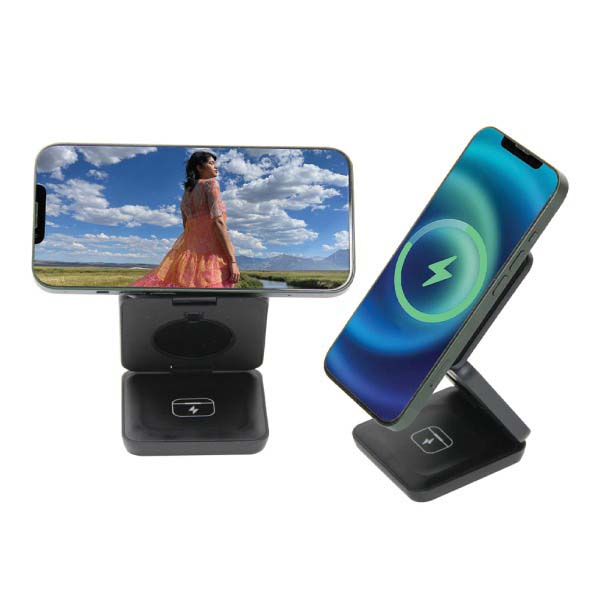 A foldable MagSafe-style 3-in-1 wireless charger for phone, earbuds, and smartwatch. Supports horizontal/vertical viewing while charging. Type-C input 5V/3A or 9V/3A; wireless outputs up to 15W. Available with logo branding in Dubai/UAE.