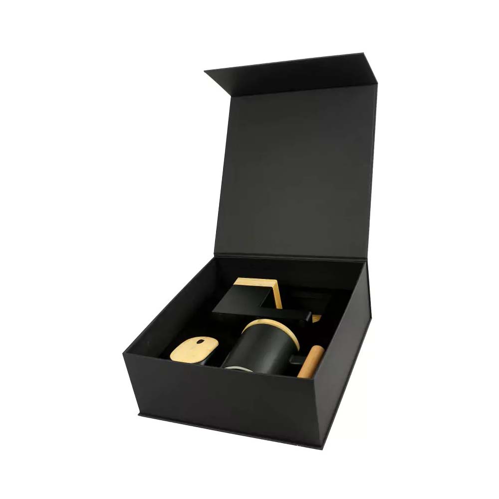 A 3-piece desk gift set packed in a natural cardboard box with cushion for corporate gifting. Includes a wireless charger with pen holder, bamboo wireless mouse, and a black ceramic mug with bamboo. Available with logo branding in Dubai/UAE.