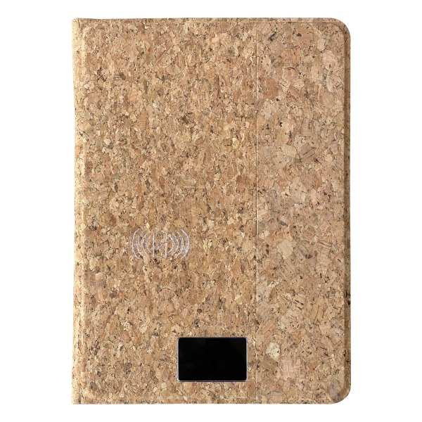 An A4 portfolio with document pocket and pen loop featuring a light-up logo 8000mAh power bank and wireless charging up to 15W. Input 5V/2.1A and output 5V/2.1A. Available with logo branding in Dubai/UAE.