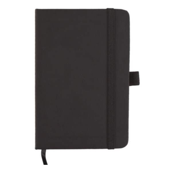 Compact A6 business assistant notebook with pen holder and elastic strap. Product size 140 x 90 x 15 mm. Available with logo branding in Dubai/UAE.