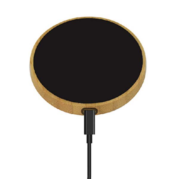 Compact bamboo wireless charging pad with an LED light-up logo branding area (listed as MagSafe-compatible). Wireless output up to 15W. Ideal for premium desk gifting. Available with logo branding in Dubai/UAE.