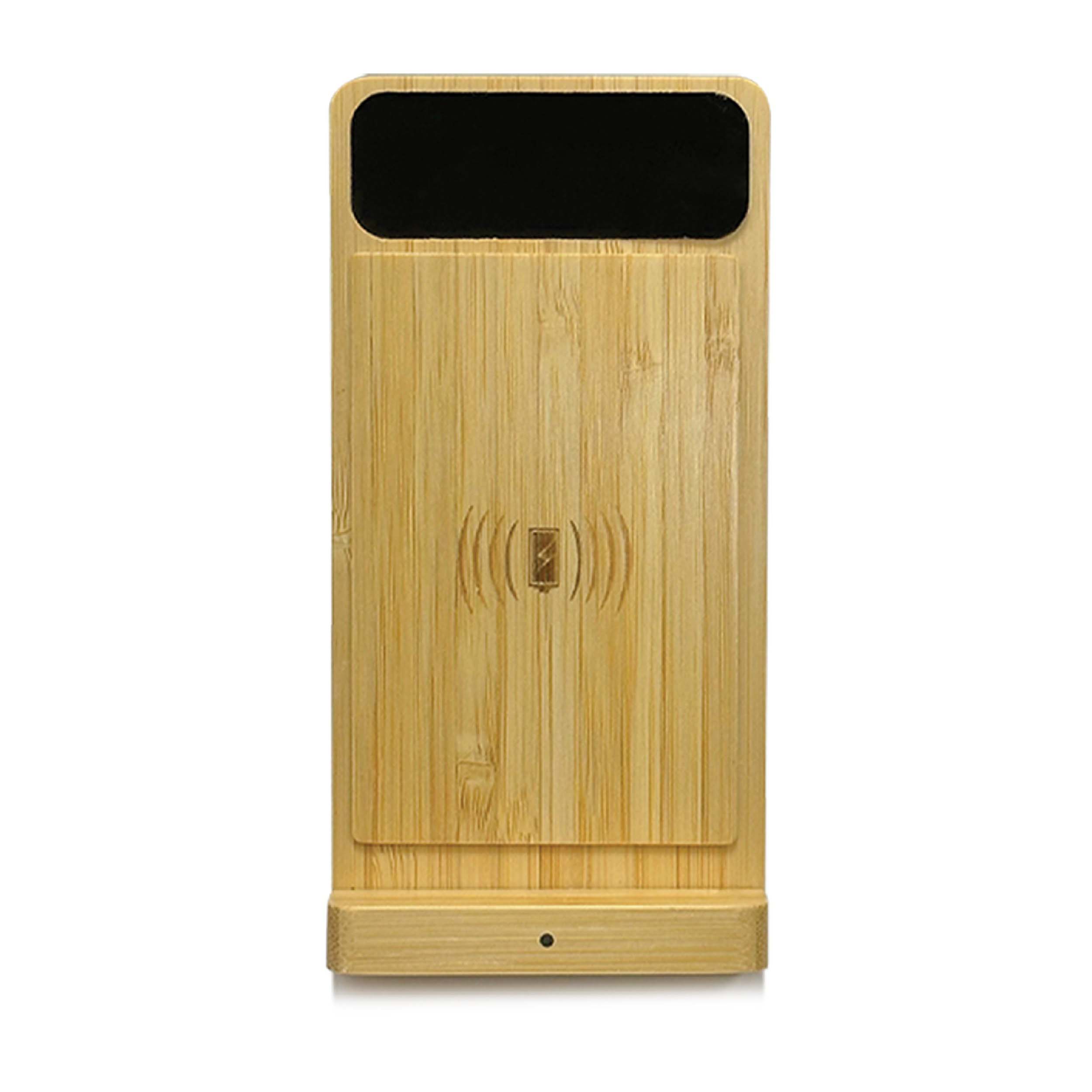 Bamboo phone holder with integrated Qi wireless charging and a light-up logo branding area. Type-C input; input 9V/1.5A or 5V/2.1A; wireless output up to 15W. Available with logo branding in Dubai/UAE.