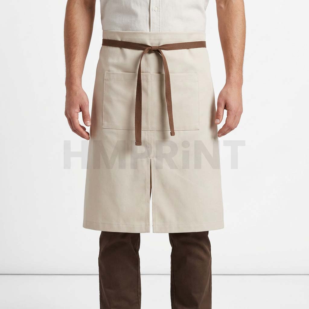 Beige bistro-style waist apron (long half apron) with brown contrast waist ties, two front patch pockets, and a center front slit for easy movement-ideal for restaurants, caf?s, and catering staff.