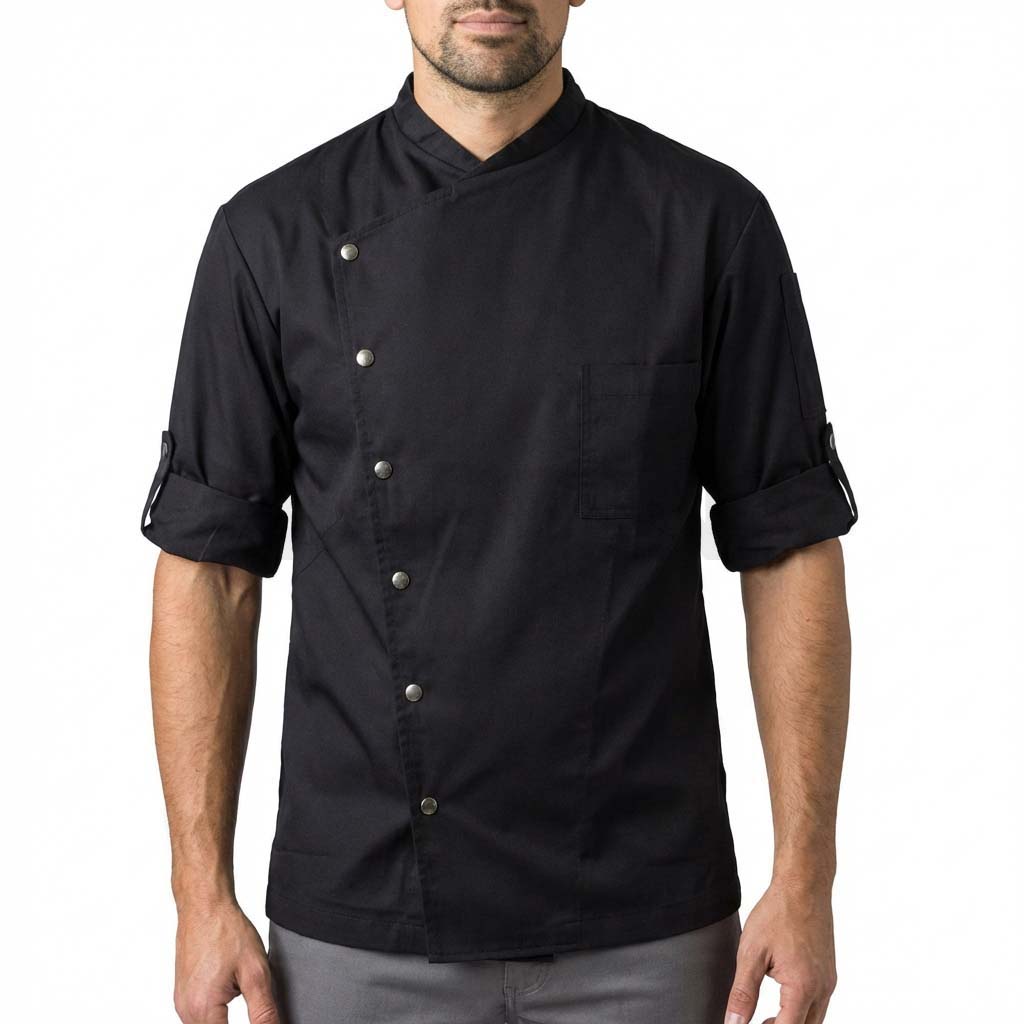 Black chef jacket/chef coat with a mandarin-style collar, asymmetric snap-button front, roll-up sleeves with tab holders, and a chest pocket-designed for a sleek, breathable professional kitchen uniform.