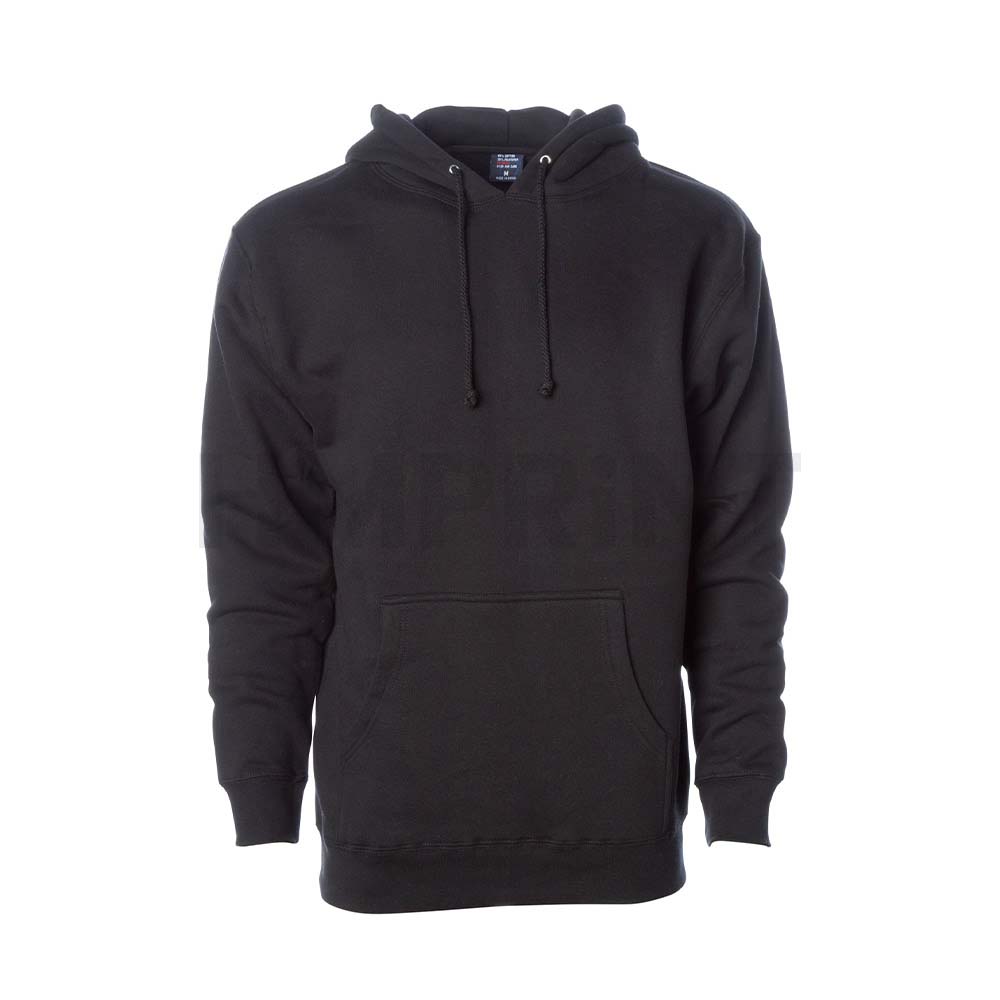 Black pullover hoodie with an adjustable drawstring hood, kangaroo front pocket, and ribbed cuffs/hem-ideal for casual wear, team uniforms, and custom printing/branding.