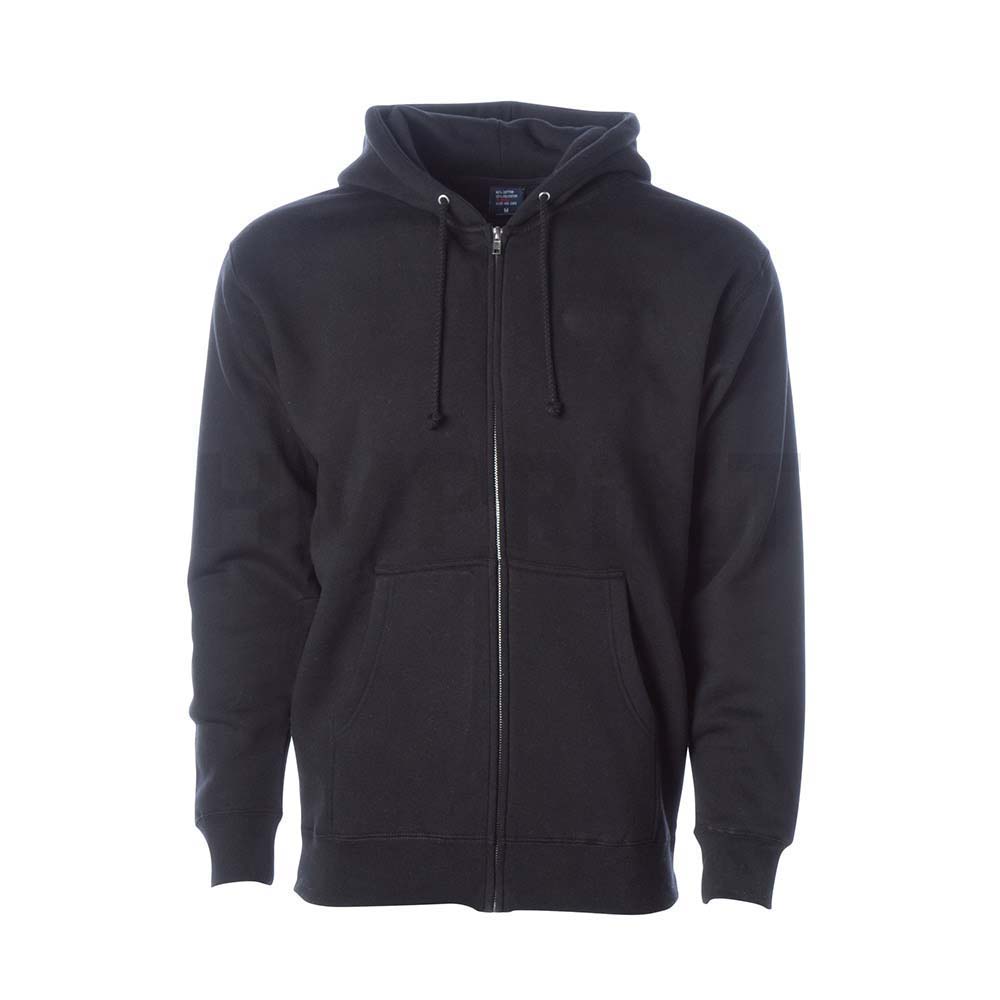 Black full-zip hoodie with an adjustable drawstring hood, full front zipper, front hand pockets, and ribbed cuffs/hem-ideal for casual wear, uniforms, and custom printing/branding.