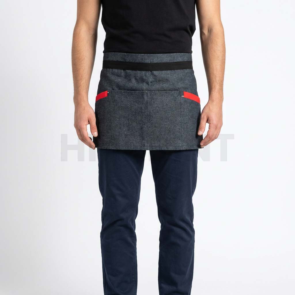 Short denim-style waist apron with a wide waistband, front pockets and red contrast trim, designed for baristas, servers, caf?s, restaurants, and service staff.