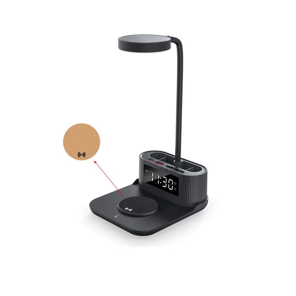 Multifunction desk lamp with touch dimming and a 360? flexible gooseneck, plus up to 15W fast wireless charging, a digital clock, and a pen holder. Includes USB-A and USB-C outputs and Type-C input for modern desktop setups. Available with logo branding in Dubai/UAE.