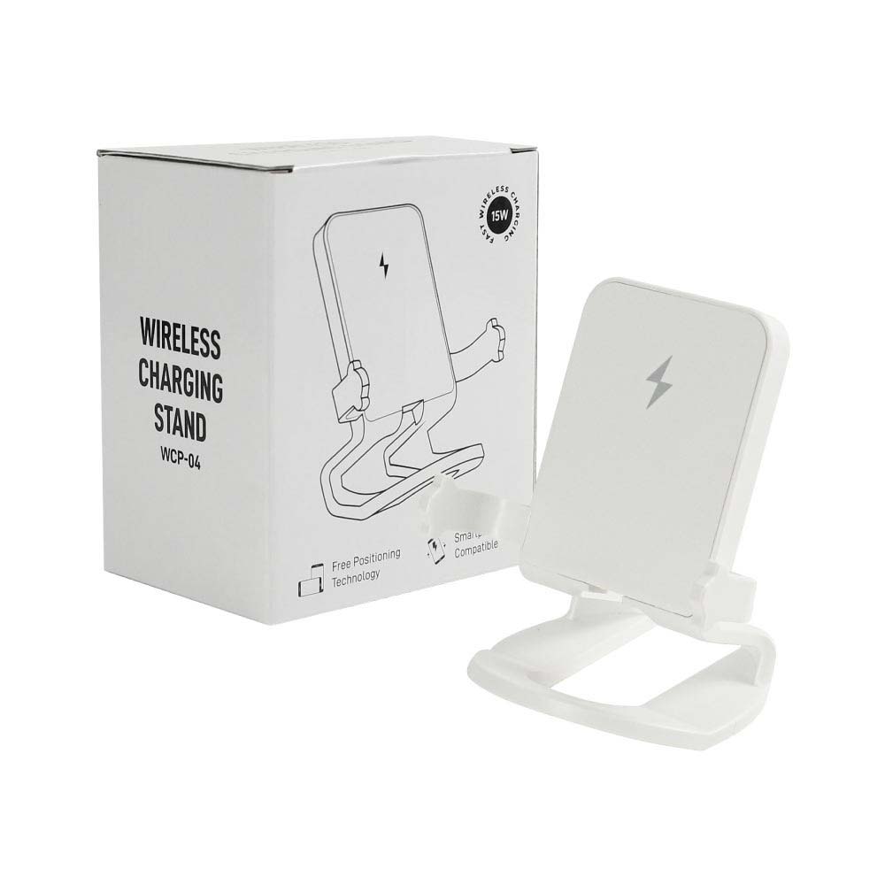 Desktop wireless charging stand made from ABS, providing up to 15W fast wireless charging for compatible smartphones. Ideal for office desks, reception counters, and everyday charging. Available with logo branding in Dubai/UAE.
