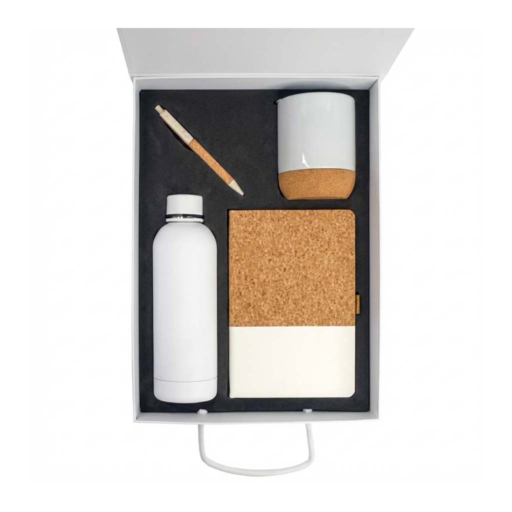 Eco-friendly office gift set in a large-handle magnetic gift box. Contents listed: cork A5 notebook, personalised cork pen, ceramic mug with cork bottom, and stainless steel water bottle with handle. Gift box size 370 x 275 x 95 mm. Available with logo branding in Dubai/UAE.