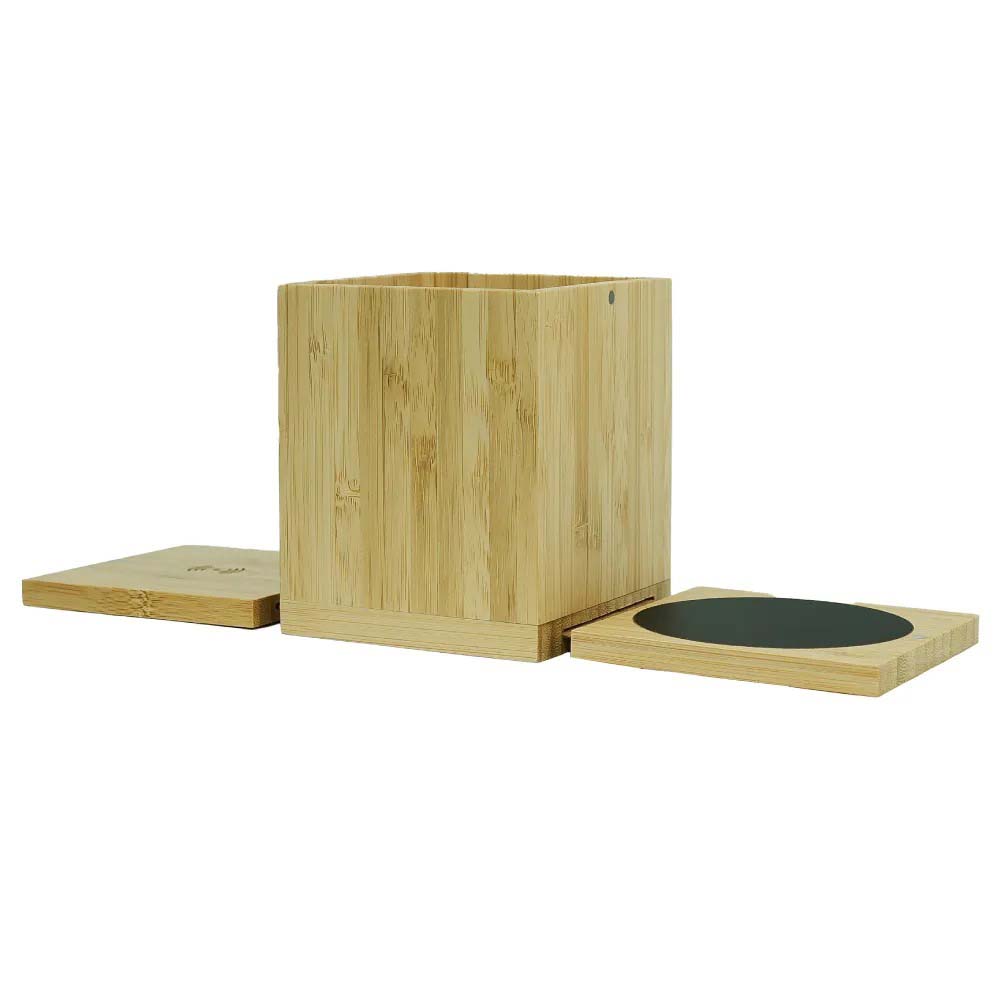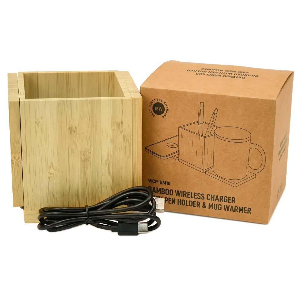 Multifunction foldable bamboo charger combining up to 15W fast wireless charging with a mug heater area and an integrated pen holder. Designed to upgrade desktop setups with a natural, premium look. Available with logo branding in Dubai/UAE.