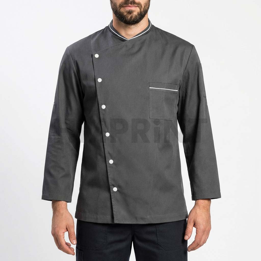 Grey Chef Coat with Side Buttons Long Sleeves and Chest Pocket
