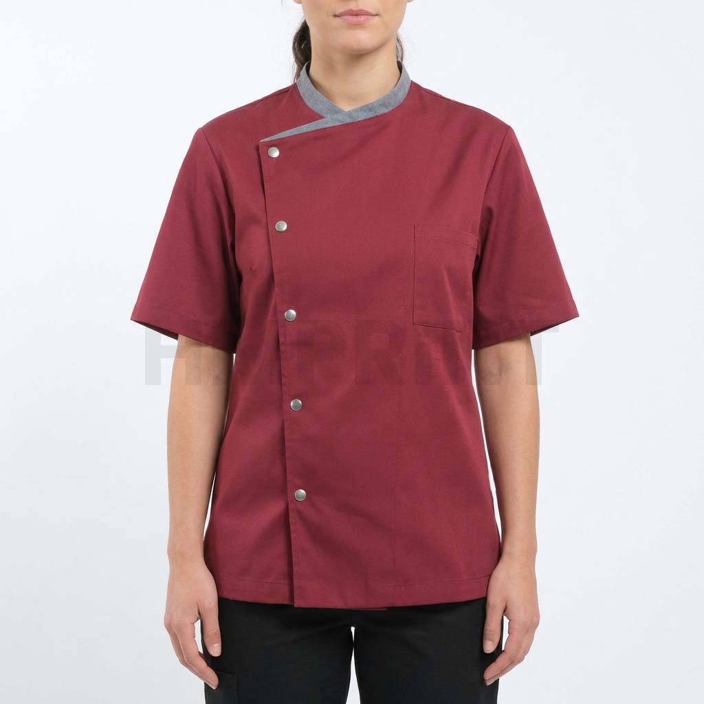 Maroon Chef Coat with Grey Collar Side Buttons Short Sleeves and Chest Pocket