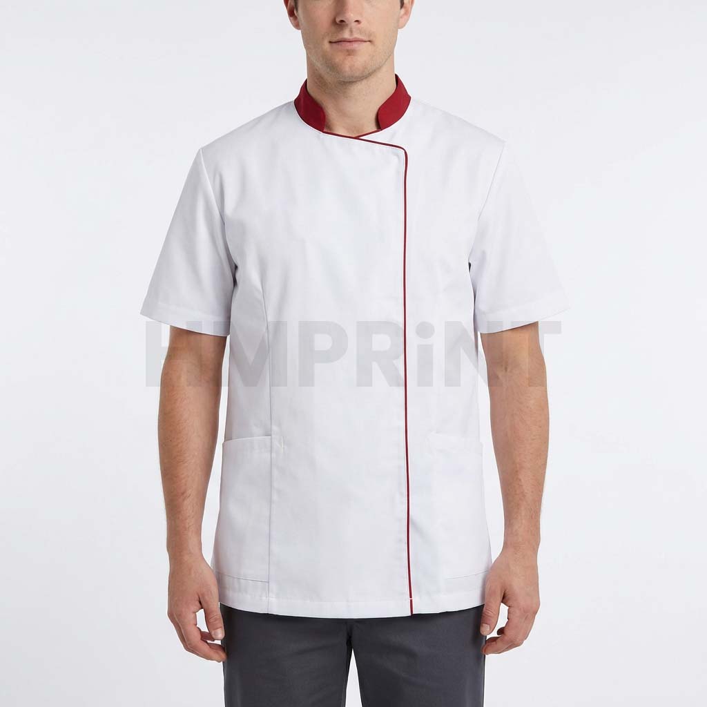 White medical tunic/scrub top with an asymmetrical wrap-style front, mandarin collar, burgundy contrast piping, short sleeves, and side pockets-ideal for clinics, hospitals, and healthcare staff.