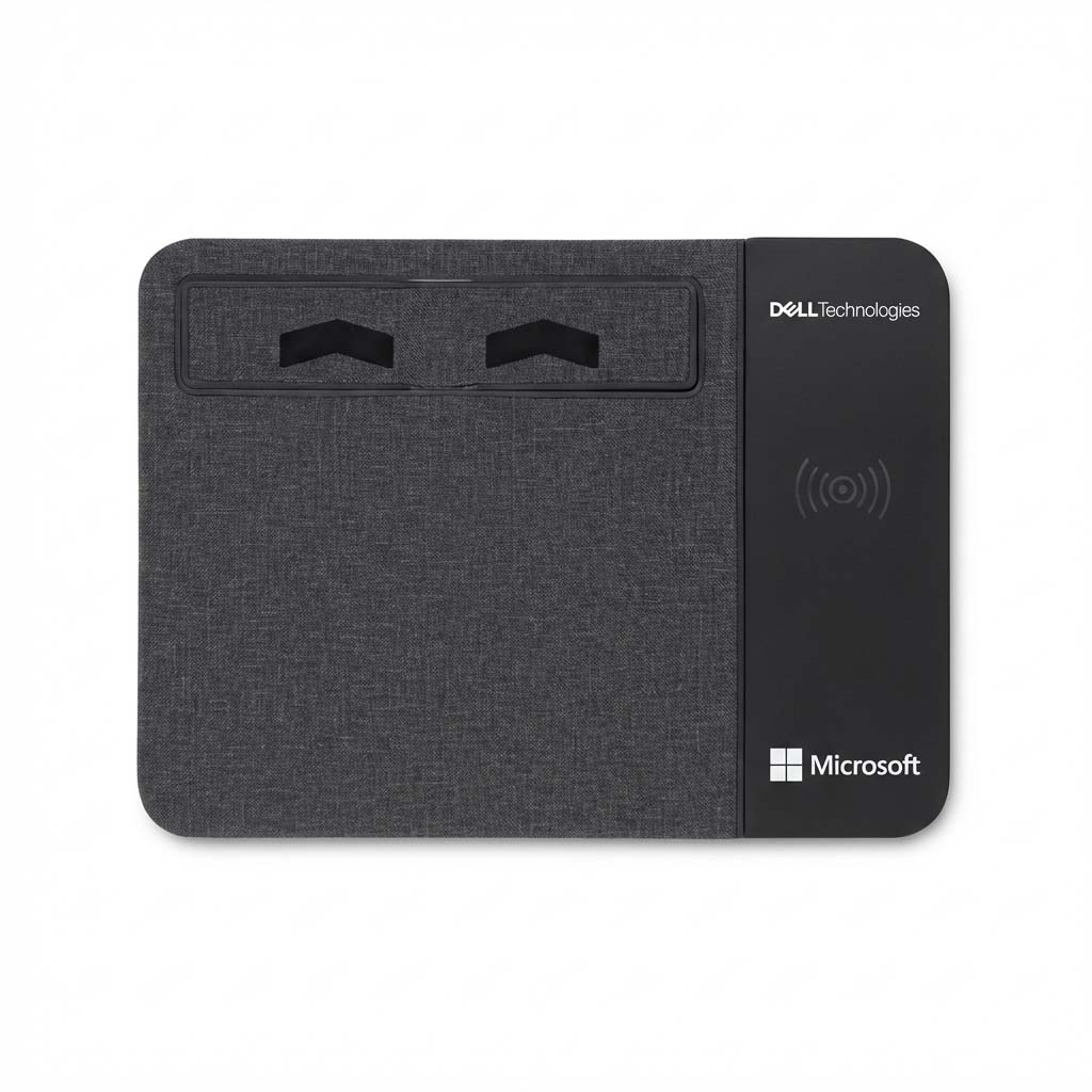 Mouse pad with wireless charging area and built-in foldable phone stand. Dedicated slot works as a phone stand, with smooth mouse surface plus charging zone for daily desk use. Product size is 300 x 220 mm. Available with logo branding in Dubai/UAE.