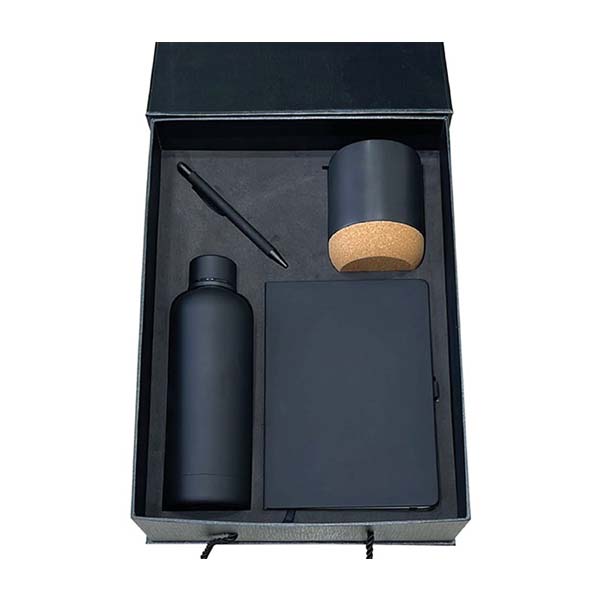 Office gift set designed for daily desk and hydration essentials. Contents listed: A5 notebook, ceramic mug with cork bottom, stainless steel water bottle with handle, and aluminium stylus pen (colors black/white as listed). Gift box size 283 x 238 x 50 mm. Available with logo branding in Dubai/UAE.