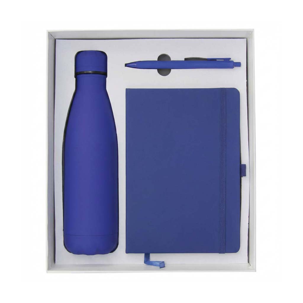 Office gift set in a large top gift box for practical everyday use. Contents listed: A5 notebook (blue), plastic ball pen, and stainless steel rubber-finish drinkware. Gift box size 300 x 255 x 100 mm. Available with logo branding in Dubai/UAE.