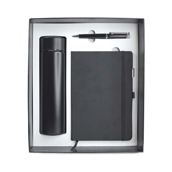 Office gift set in a large top gift box with practical everyday items. Contents listed: A5 notebook, metal pen, and stainless steel drinkware. Gift box size 300 x 255 x 100 mm. Available with logo branding in Dubai/UAE.