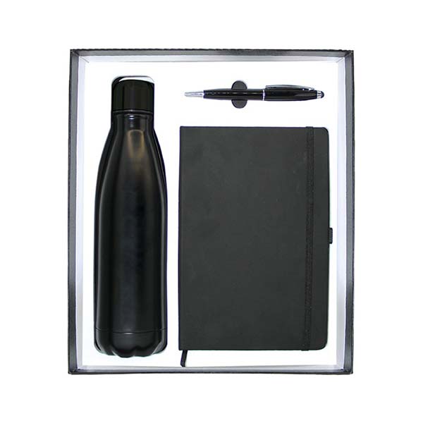 Office gift set in a top gift box with everyday essentials. Contents listed: A5 PU notebook (black), stainless steel water bottle, and metal pen with stylus. Gift box size 280 x 245 x 28 mm. Available with logo branding in Dubai/UAE.