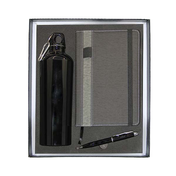 Office gift set in a top gift box for simple, practical gifting. Contents listed: A5 notebook, sports promotional water bottle, and metal twist ball pen. Gift box size 280 x 245 x 28 mm. Available with logo branding in Dubai/UAE.