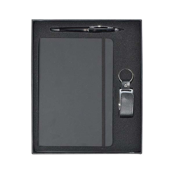 Office gift set in a top gift box. Contents listed: AN-01 A5 PU notebook (black), metal ball pen with stylus, and AF-023 leather & metal USB flash drive. Gift box size 280 x 245 x 28 mm. Available with logo branding in Dubai/UAE.
