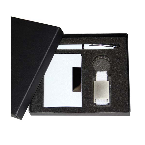 Compact office gift set in a top small gift box. Contents listed: metal keychain with fabric strap, metal pen with stylus, and business card holder. Gift box size 170 x 145 x 26 mm. Available with logo branding in Dubai/UAE.