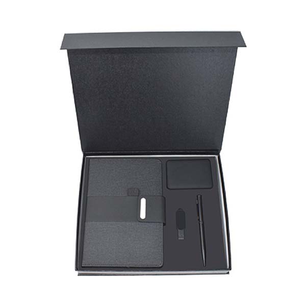 Office gift set packed in a magnetic gift box for premium presentation. Contents listed: slim metal pen, slim LED USB flash drive, mini light-up logo power bank, and A5 notebook (office & business). Gift box size 283 x 238 x 50 mm. Available with logo branding in Dubai/UAE.