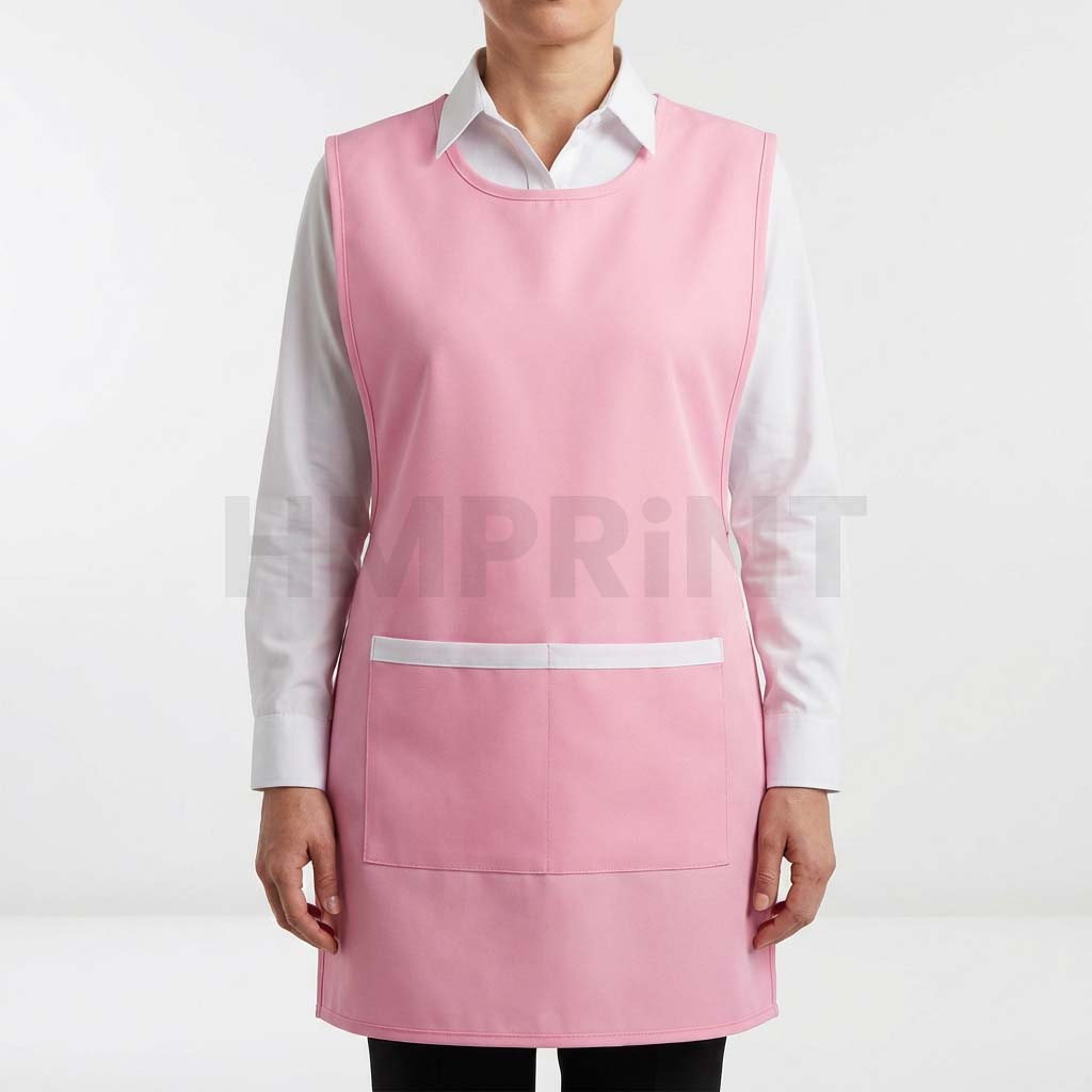 Pink sleeveless uniform tunic/tabard apron with a round neckline and a large front patch pocket with contrast detail-ideal for housekeeping, salon, spa, cleaning, and service staff.