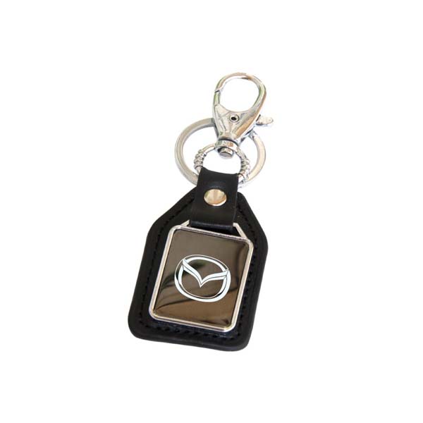Rectangular keychain with silver plate finish and leather strap loop with split ring. Product size is 110 x 38 mm. Available with logo branding in Dubai/UAE.
