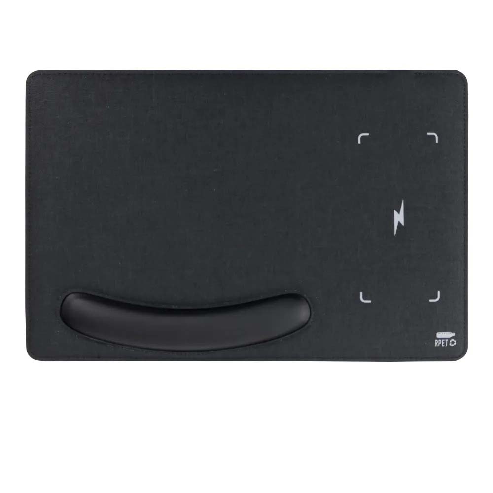 RPET fabric mousepad with an integrated wireless charging area and a wrist rest for added comfort during long desk sessions. Finished with PU for a clean look. Available with logo branding in Dubai/UAE.
