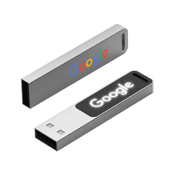 Slim silver metal USB flash drive with LED light-up logo effect via engraving. Capacities Available: 8GB/16GB/32GB. Size 50 x 12 x 5 mm. Available with logo branding in Dubai/UAE.