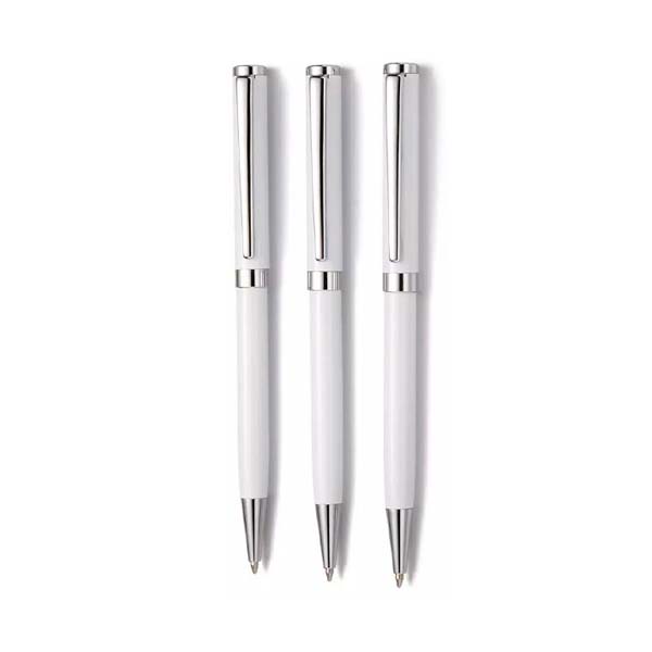 Slim twist-action metal ballpoint pen designed for office and executive use. Product size is 136 x 10 mm. Available with logo branding in Dubai/UAE.