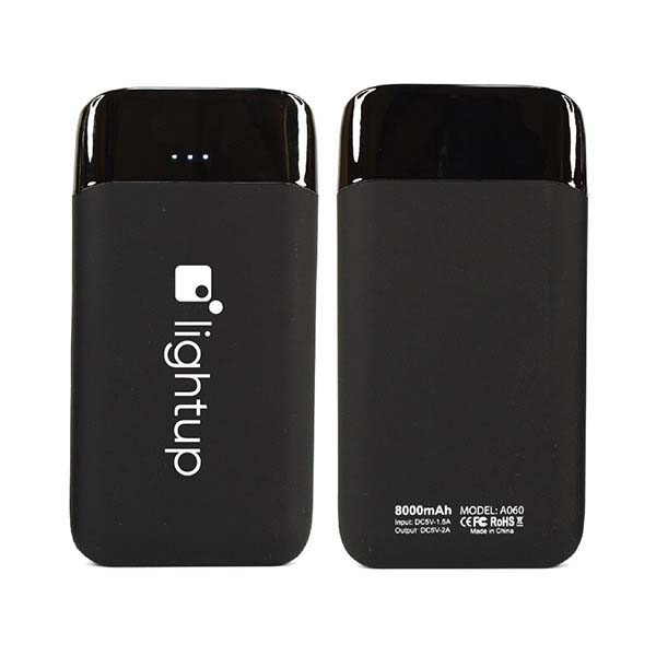 8000mAh Li-polymer power bank with light-up logo and rubberized finish. Input 5V/2A; output 5V/1.5A. Ports: 2x USB, Micro-USB, and Type-C. Includes Micro-USB cable (dual cable optional). Available with logo branding in Dubai/UAE.