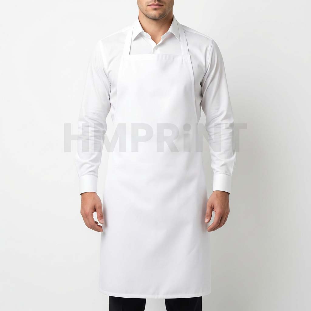 Full-length white bib apron with neck strap and waist ties, designed for kitchen, chef, restaurant, bakery, and service work for clean, professional coverage.