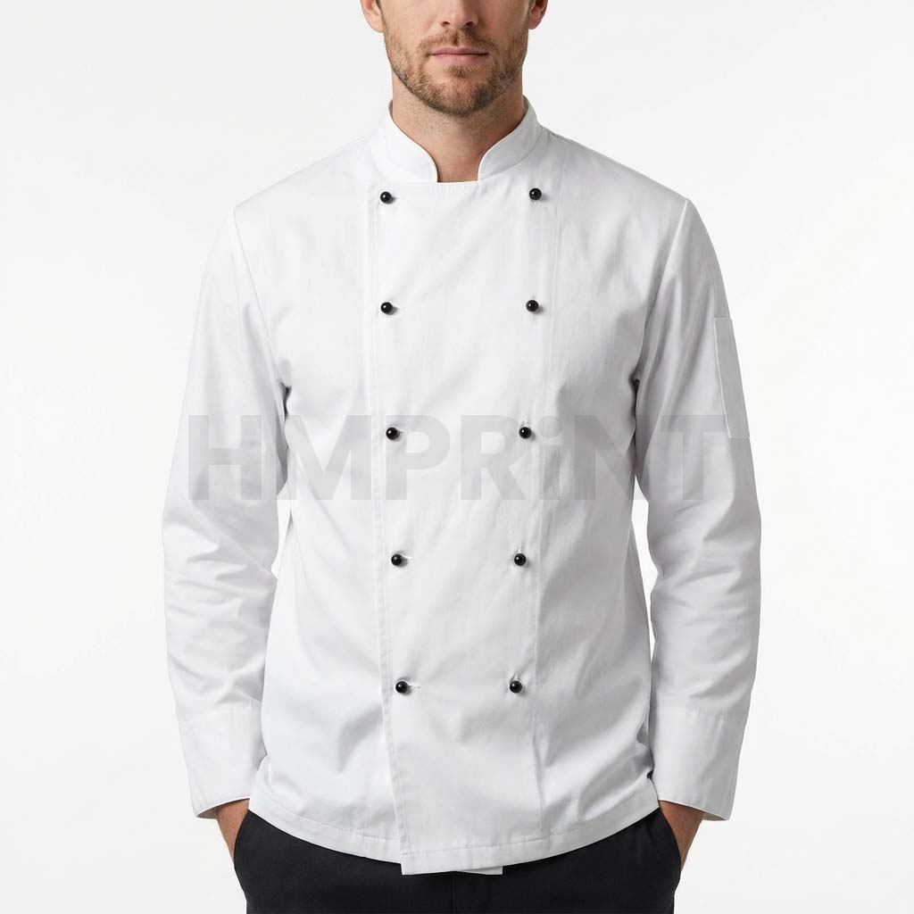 White long-sleeve chef jacket/chef coat with a double-breasted front, stand collar, and black button detailing, designed for professional kitchen and restaurant use.