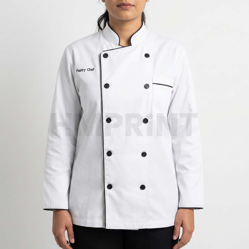 White long-sleeve chef jacket/chef coat with a double-breasted front, black buttons, and black contrast piping on the collar, placket, cuffs, and chest pocket-ideal for professional kitchen and pastry chef uniforms.