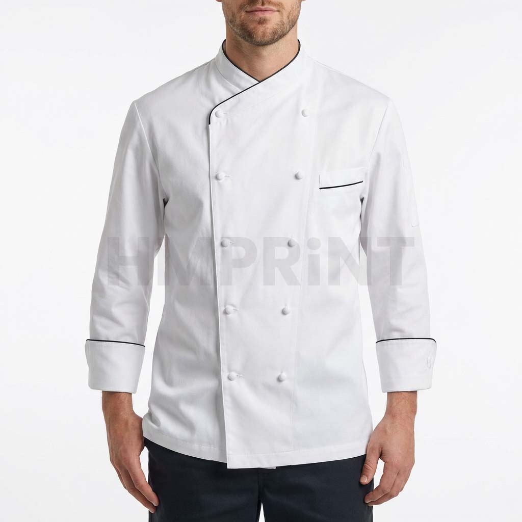 White long-sleeve chef jacket/chef coat with a double-breasted front, stand collar, and black contrast piping on the collar, cuffs, and chest pocket-ideal for professional kitchen and restaurant uniforms.