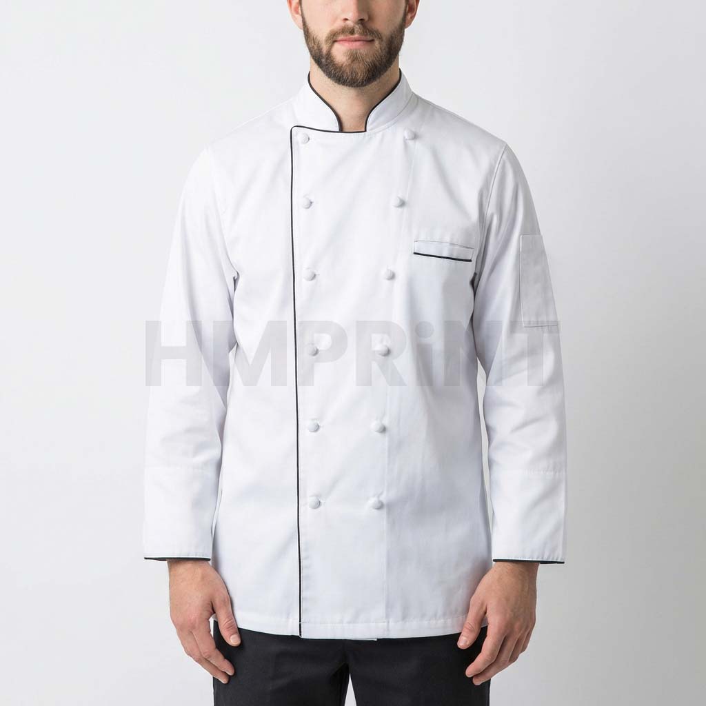 White long-sleeve chef jacket/chef coat with a double-breasted front, stand collar, subtle black piping on the front edge and chest pocket, designed for professional kitchen and restaurant uniforms.