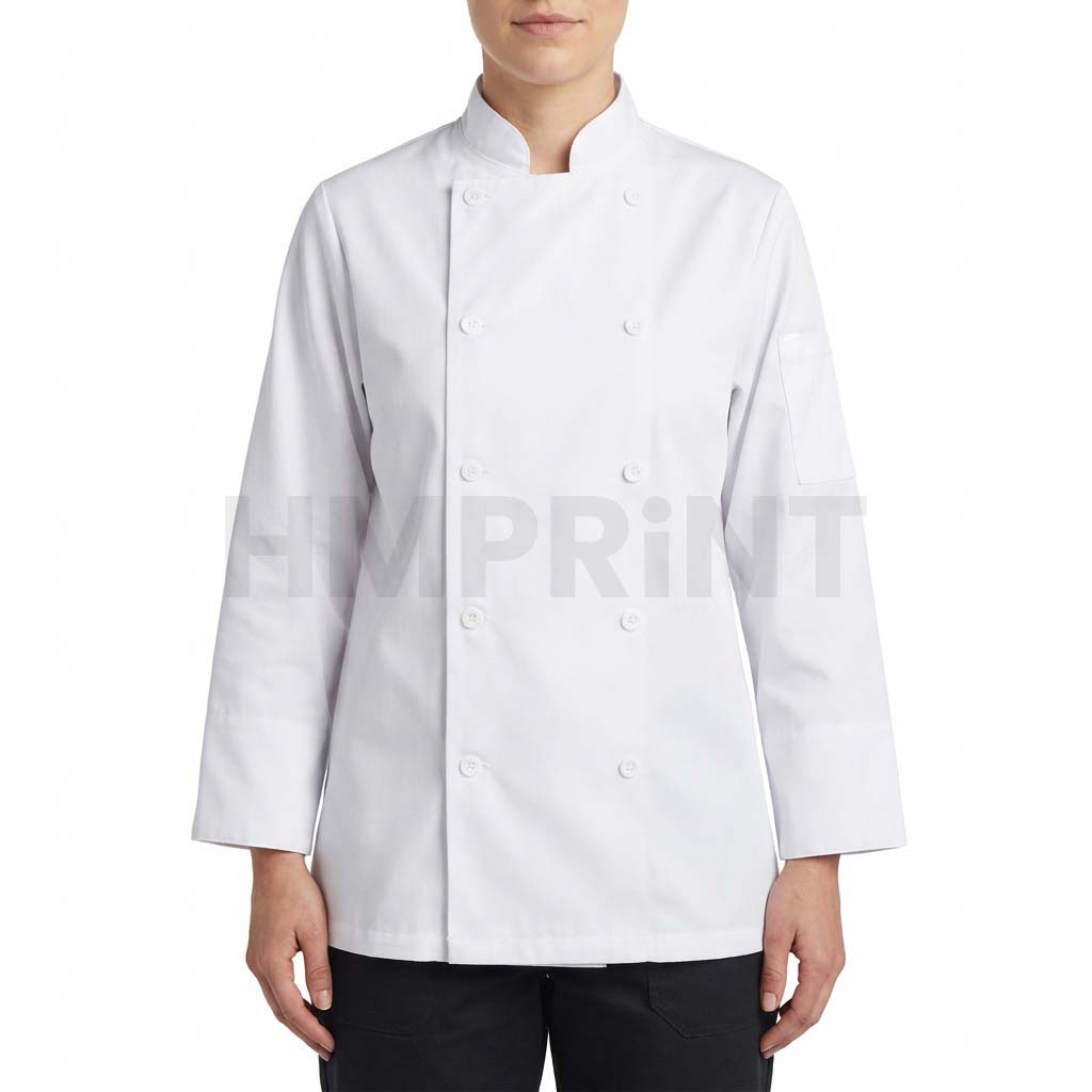 White long-sleeve chef jacket/chef coat with a double-breasted front, stand collar, and a sleeve pocket, designed for professional kitchen and restaurant uniforms.
