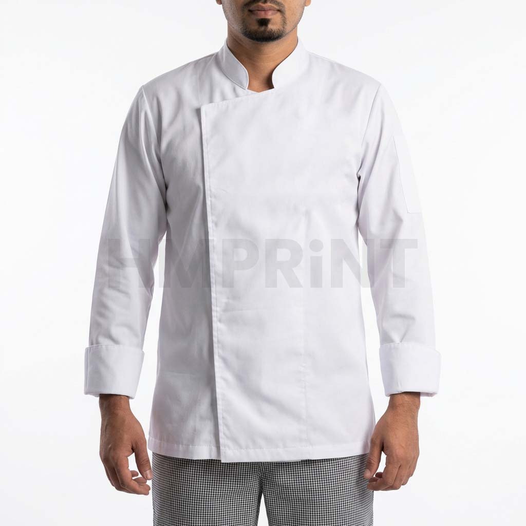 White Chef Coat with Hidden Front Stand Collar Long Sleeves and Turn Up Cuffs