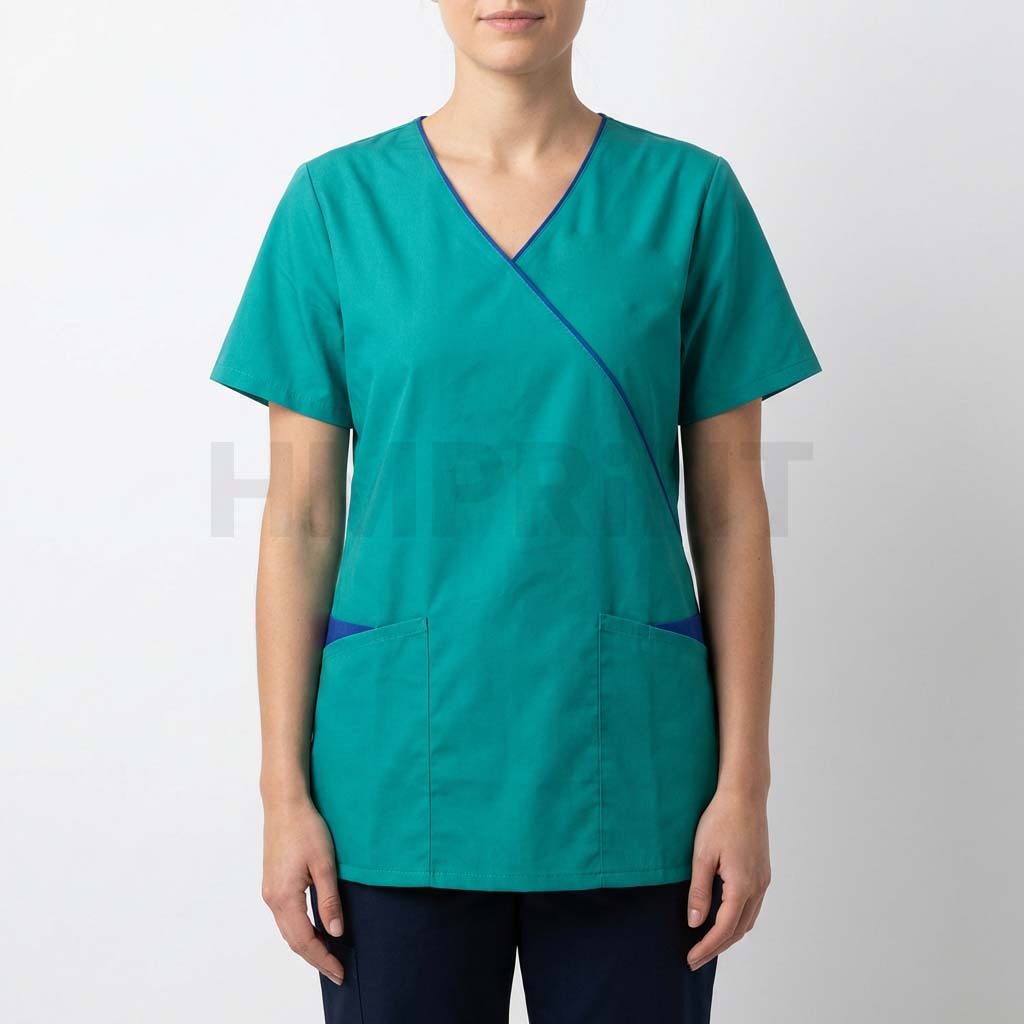 Teal wrap/crossover scrub top with navy contrast trim, short sleeves, and two front patch pockets, designed for comfortable, professional wear in clinics and hospitals.