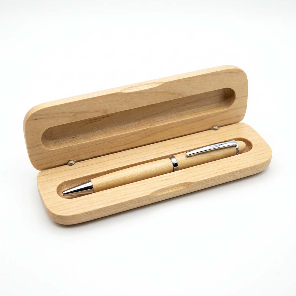 Natural wooden pen box with matching lid and fitted insert for 1 pen, ideal for gift presentation and premium sets. Size 171 x 54 x 24 mm. Available with logo branding in Dubai/UAE.